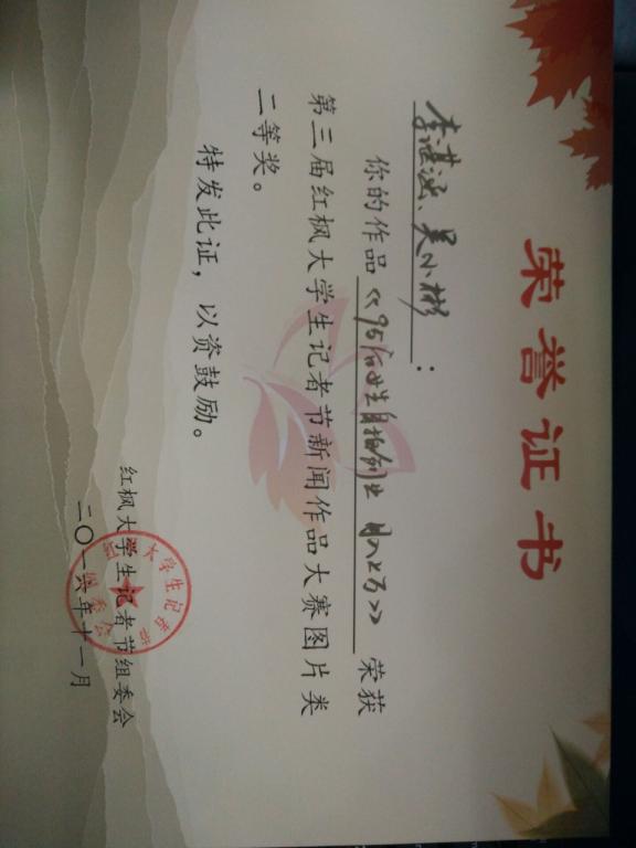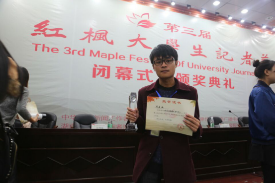11月20日9时,由中华全国新闻工作者协会指导、湖南省新闻工作者协会、湖南大学、湖南日报报业集团、湖南广播电视台联合主办,湖南大学新闻传播与影视艺术学院承办的全国性大学生记者活动——“红枫大学生记者节”在长沙完美落幕。我院14级医检专业的学生李谌涵荣获本届“红枫大学生记者节”新闻作品大赛图片类二等奖。